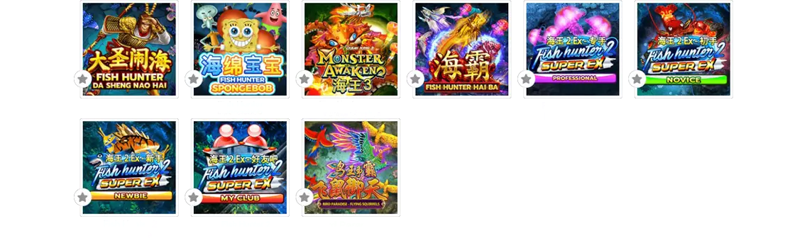 Insect Paradise, Fishermans Wharf, Fish Hunting: Yao Qian Shu, Fish Hunting: Li Kui Pi Yu, Fish Hunting: Happy Fish 5, Fishhunting:goldentoad, Fish Hunting: Da Sheng Nao, Fish Hunter Spongebob, Fish Hunter Monster Awaken, Fish Haiba, Fish Hunter 2 Ex - Pro, Fish Hunter 2 Ex - Novice, Fish Hunter 2 Ex - Newbie, Fish Hunter 2 Ex - My Club, Bird Paradise.