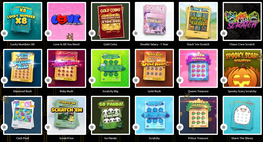 Happy Scratch, Lucky Scratch, Express 200 Scratch, Shave The Beard, Cut The Grass, Scratch! Gold, Koi Cash, Summer Scratch, The Perfect Scratch, Scratch! Silver, Lucky Numbers X20, Lucky Numbers X16, Lucky Numbers X12, Dream Car Urban, Scratch! Bronze, Break The Ice, Dream Car Speed, Dream Car Suv, Cash Vault I, Football Scratch, Frogs Scratch, Cash Vault Ii, Lucky Shot, It's Bananas!, Lucky Numbers X8, Love Is All You Need, Gold Coins, Double Salary - 1 Year, Stack 'em Scratch, Chaos Crew Scratch, Diamond Rush, Ruby Rush, Scratchy Big, Gold Rush, Queen Treasure, Spooky Scary Scratchy, Cash Pool, Scratch’em, Go Panda, Scratchy, Prince Treasure, Shave The Sheep, Crazy Donuts, King Treasure, Snow Scratcher, Eggstra Cash, Rat Riches, Scratchy Mini, Tiger Scratch, Cash Scratch, Scratch! Platinum.